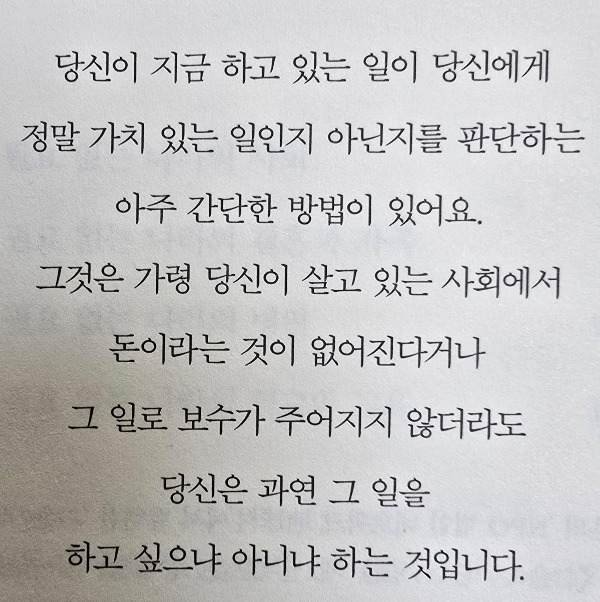 책을 읽고 난 후, 나의 삶을 돌아보게 되었다. 나는 정말 내가 원하는 삶을 살고 있는가? 아니면 돈을 벌기 위해 어쩔 수 없이 선택한 길을 가고 있는가? 이 책이 던지는 질문들은 우리의 삶을 더 깊이 성찰하게 만든다.