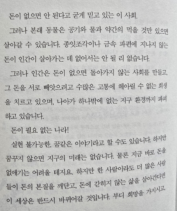 특히 저자가 직접 경험한 자급자족 생활과 생태적 삶의 방식을 바탕으로 서술된 내용은 현실적이며 설득력이 있다. 이 독후감에서는 ‘돈이 필요 없는 나라’가 전하는 주요 메시지를 정리하고, 책이 주는 시사점과 나의 생각을 함께 나누고자 한다.